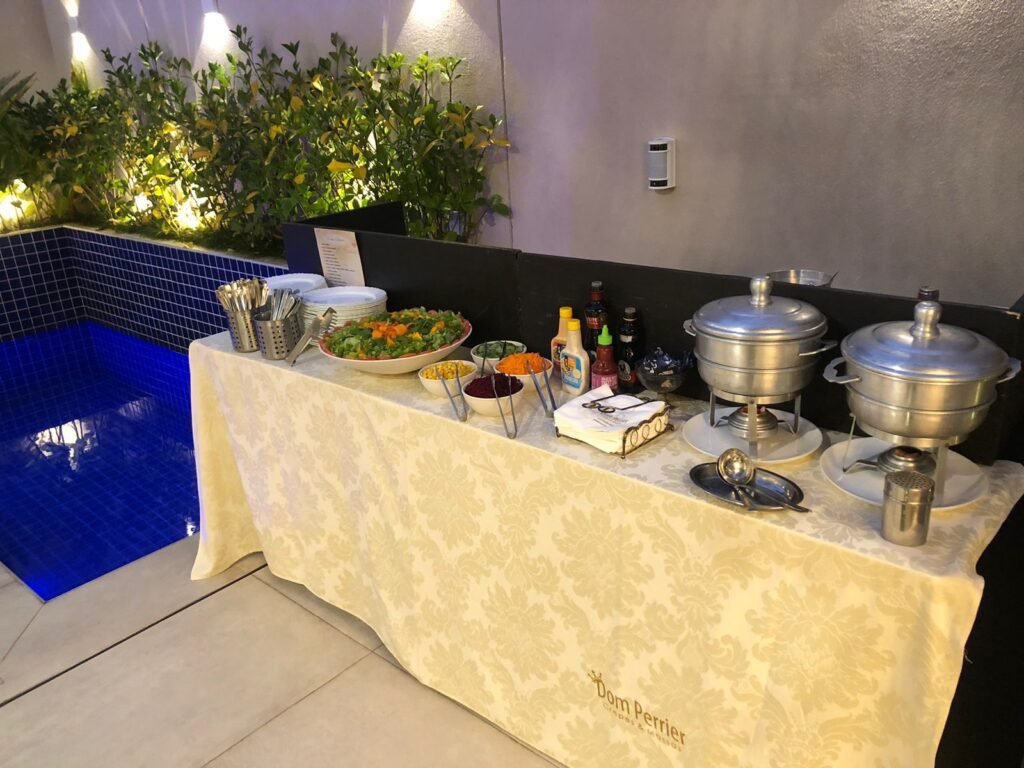 Incluso: Pratos de Porcelana | Talheres de Inox | Copos de Vidro para Refrigerante e Água | Guardanapos de Papel |1 mesas de 2,20m por 1,10m para montagem do Buffet | Equipe – a quantidade de funcionários será definida á partir do número de convidados fechados garantido um ótimo serviço.